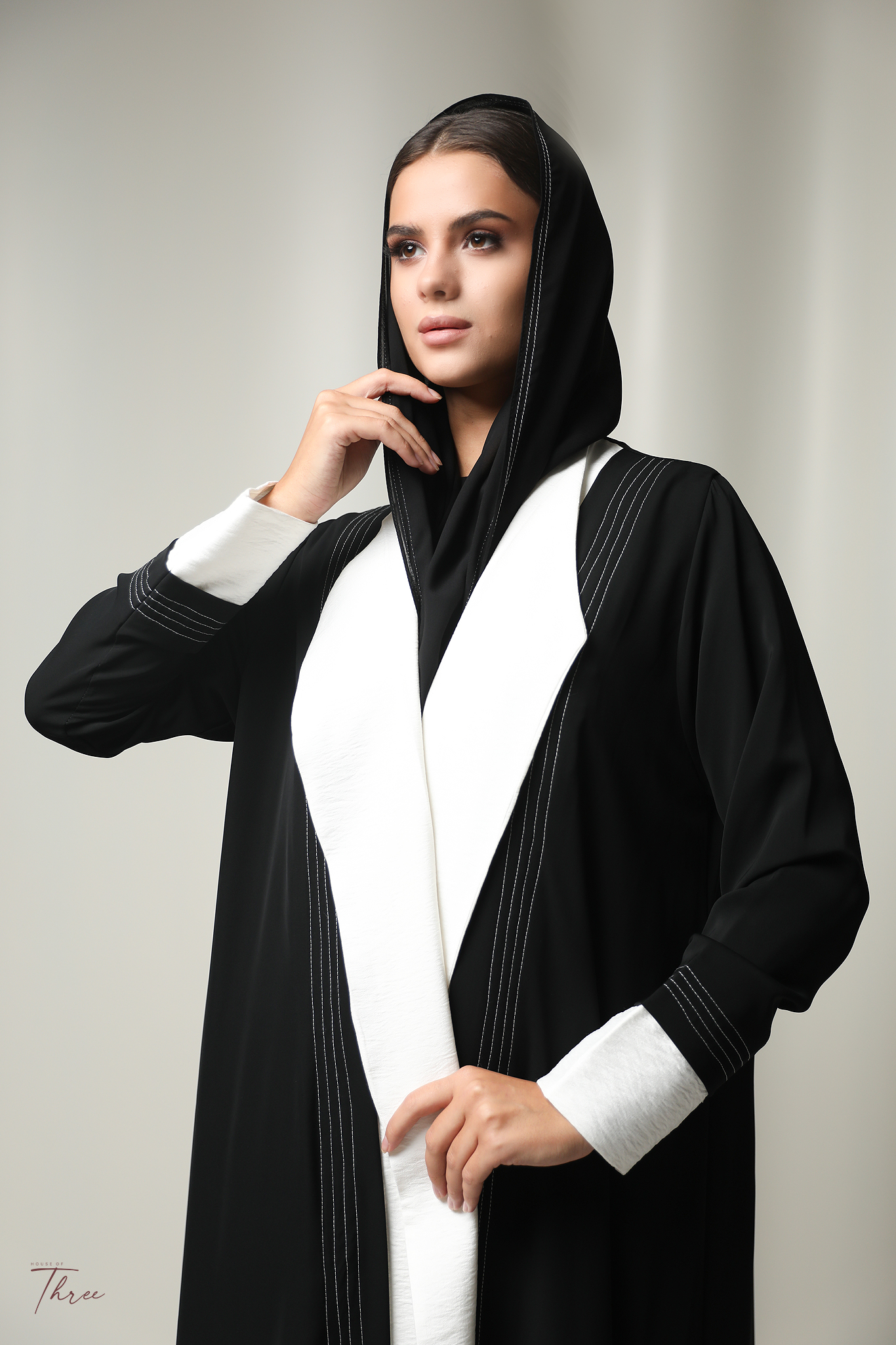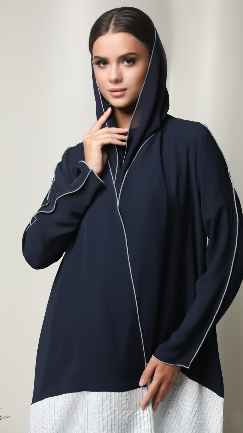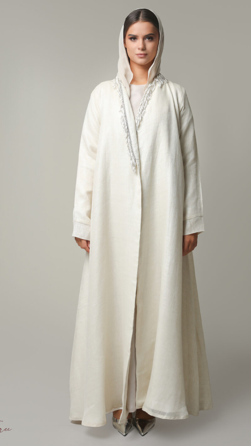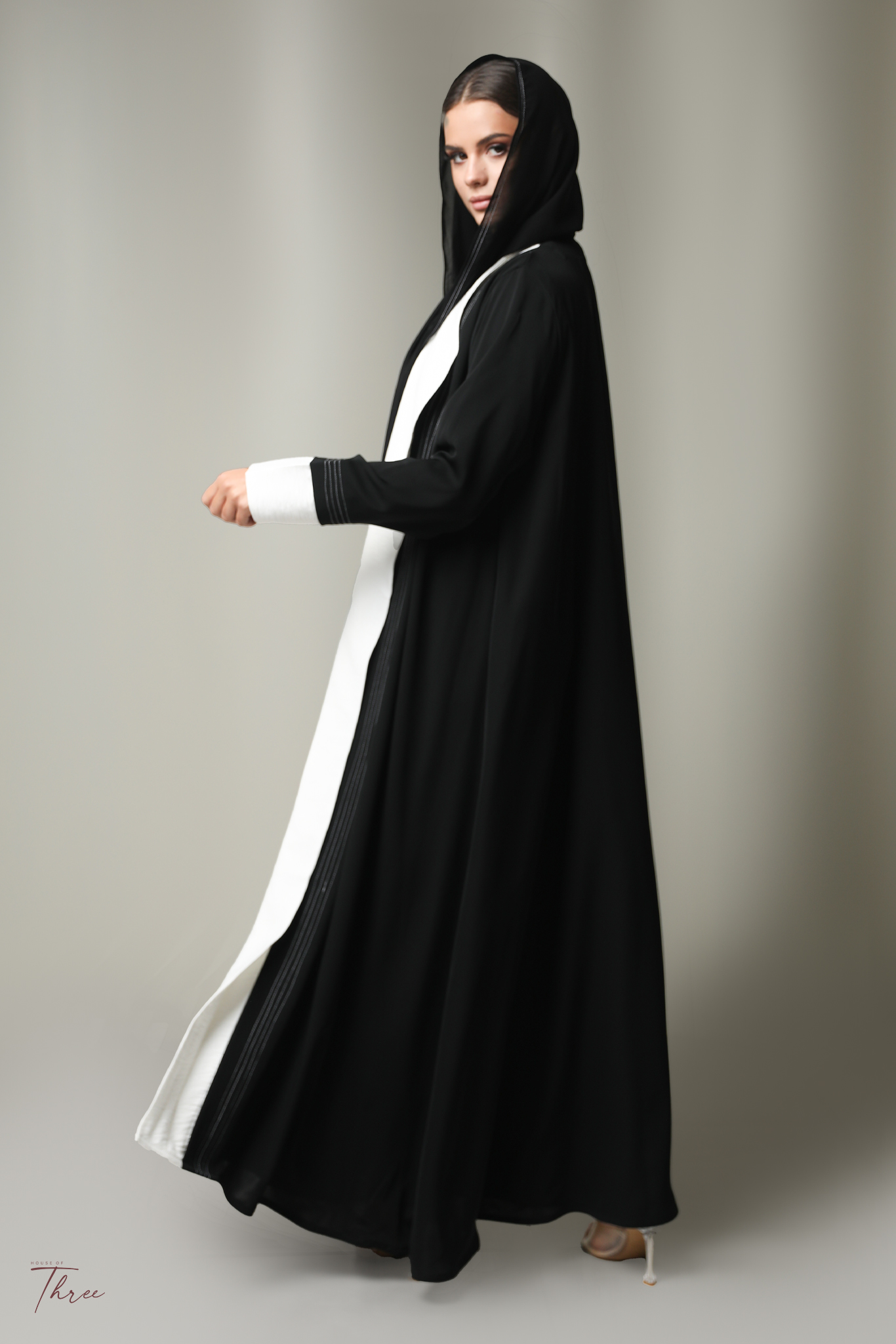 Black crepe abaya with  white and headscarf.