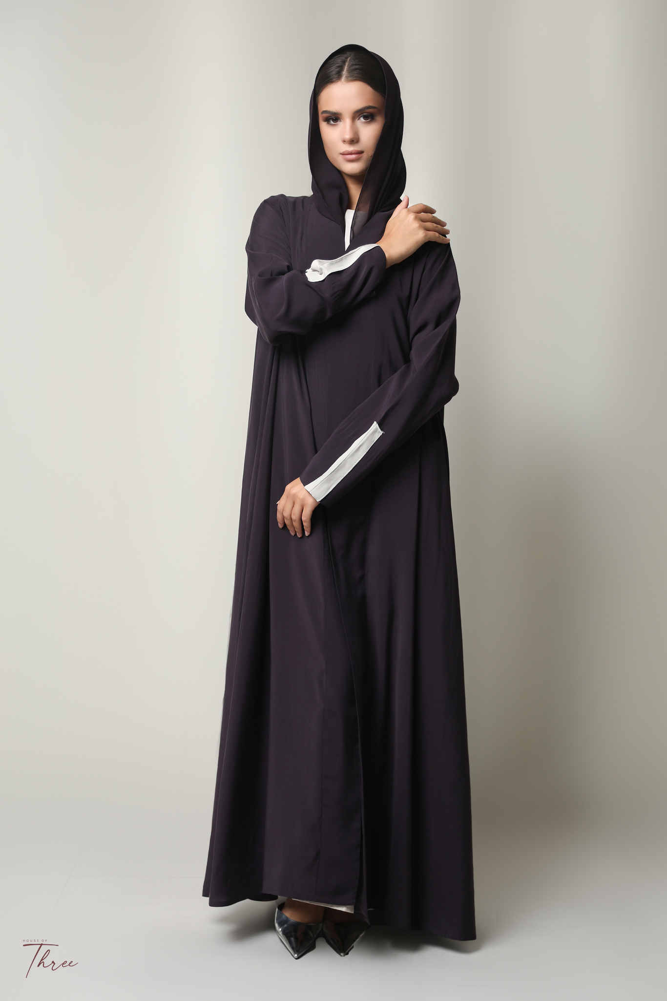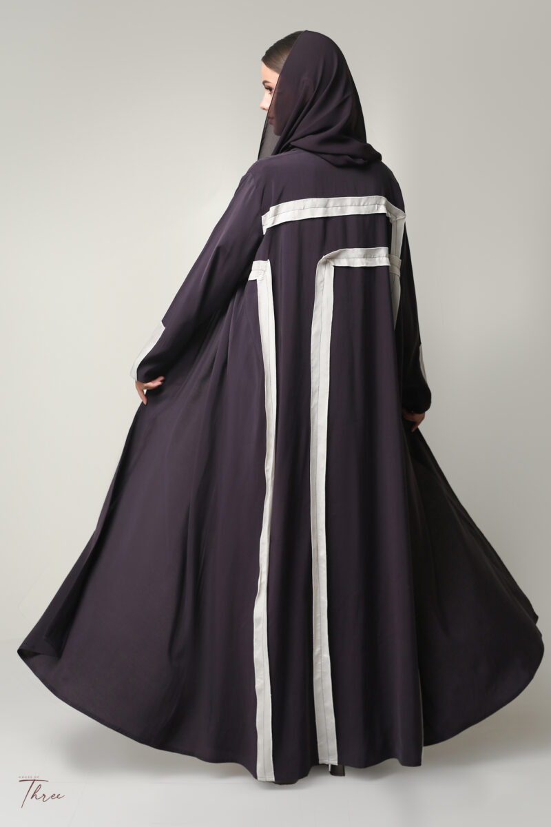 Washed purpel silk abaya with light pink in the back and headscarf.